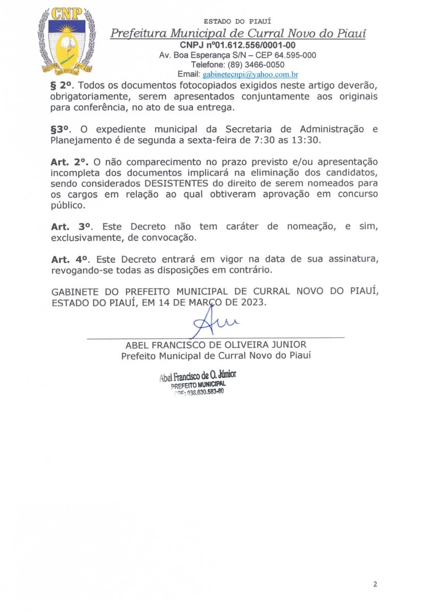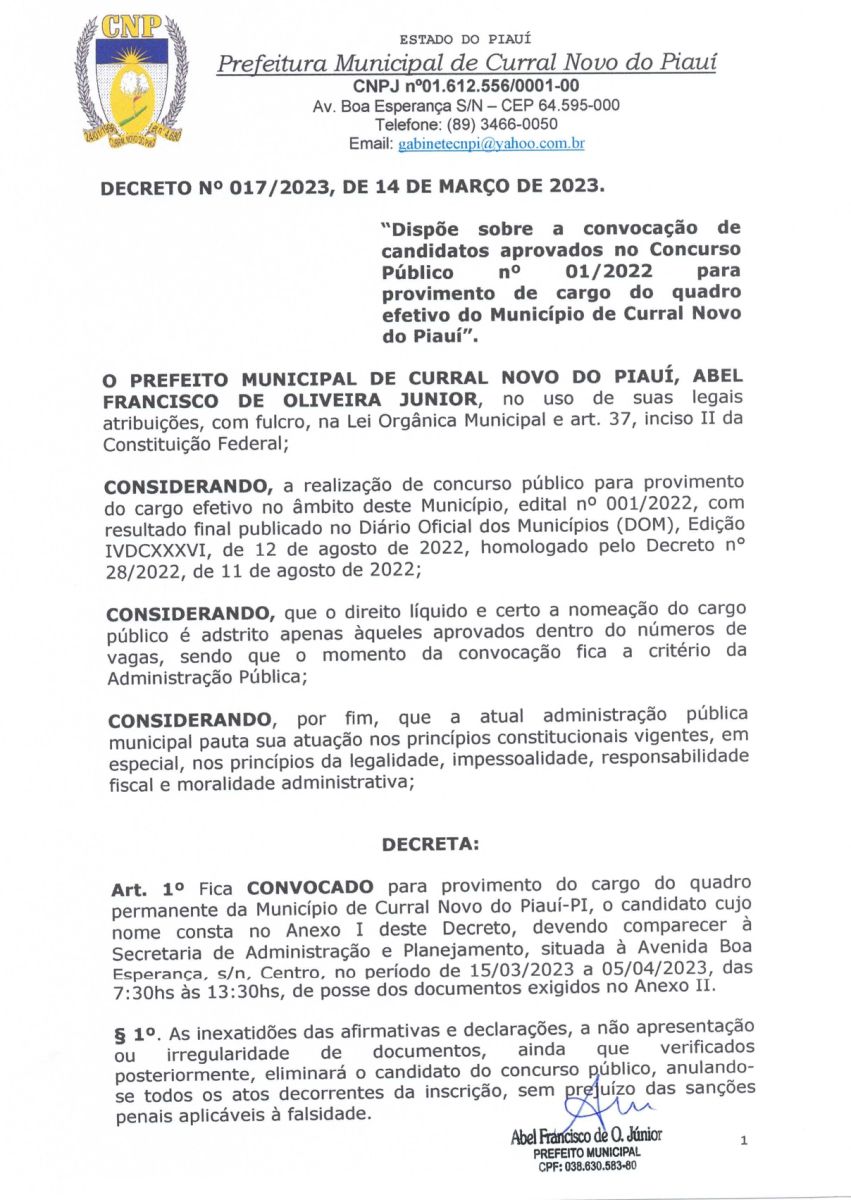 Fica CONVOCADO para provimento do cargo do quadro permanente do Município de Curral Novo do Piauí - PI, o candidato cujo nome consta no ANEXO I deste Decreto, devendo comparecer à Secretaria Municipal de Administração e Planejamento na Sede da Prefeitura Municipal, situada à Avenida Boa Esperança, s/n, Centro, no período de 15/03/2023 a 05/04/2023, das 7:30hs às 13:30hs, de posse dos documentos exigidos no ANEXO II.