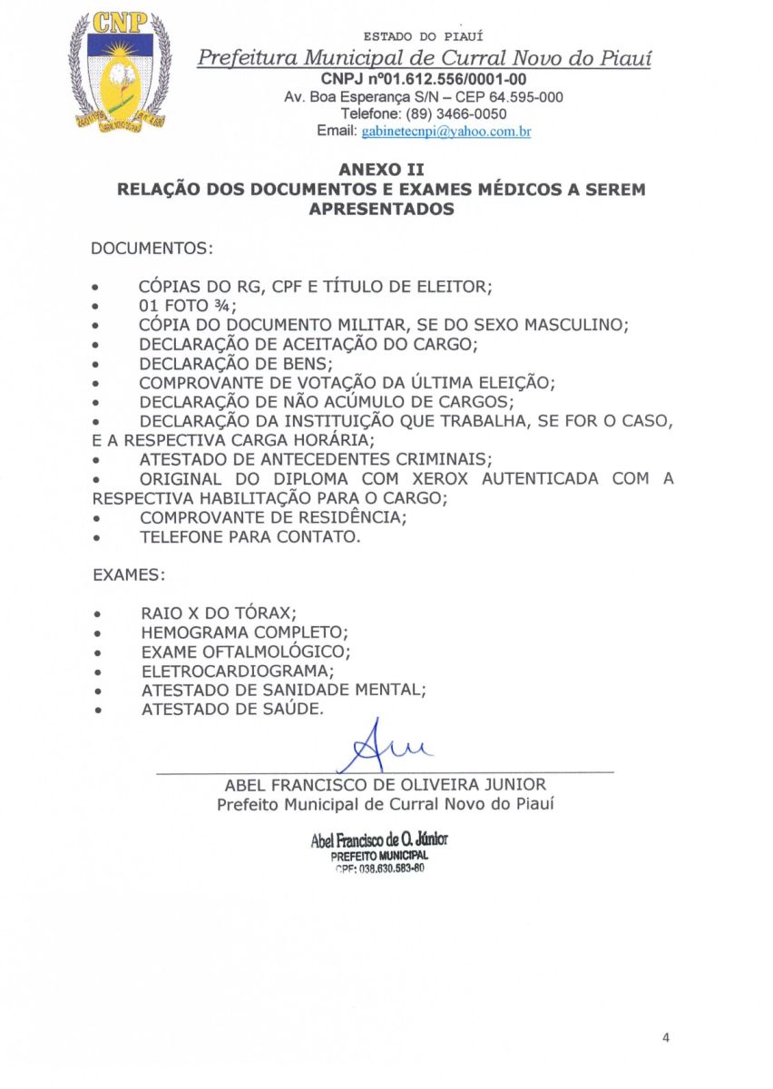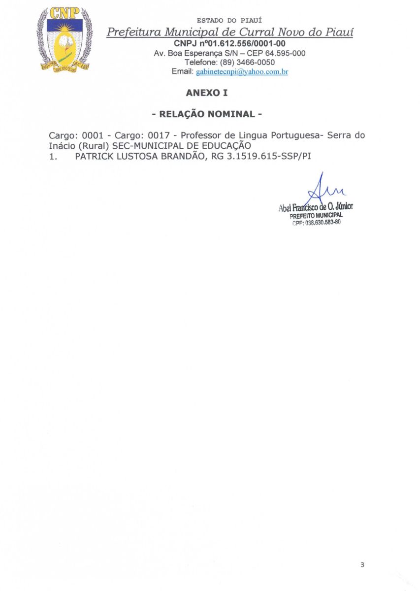A PREFEITURA MUNICIPAL DE CURRAL NOVO DO PIAUI CONVOCA O CANDIDATO APROVADO EM CONCURSO PÚBLICO Nº 001/2022.