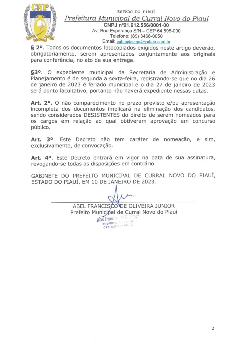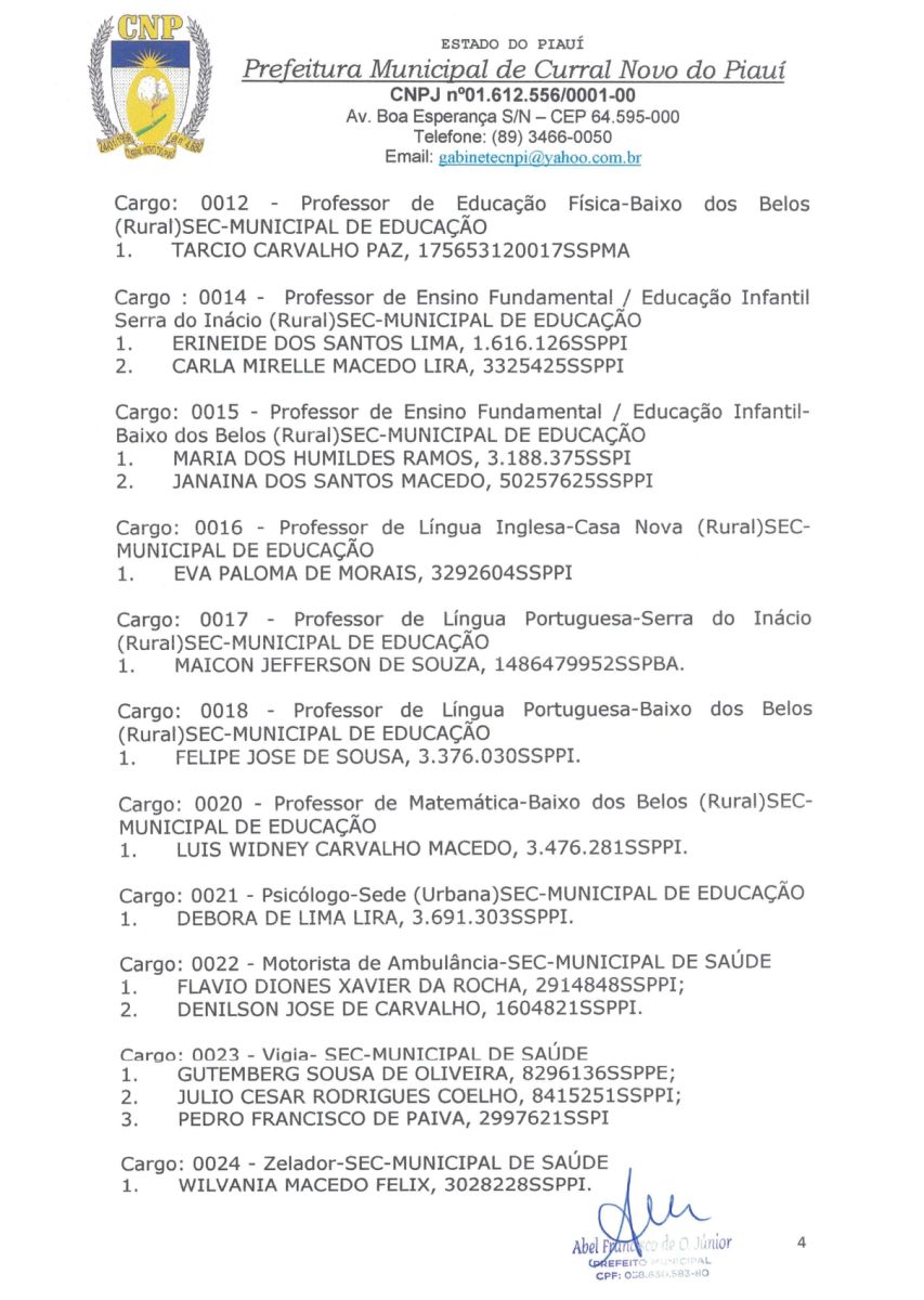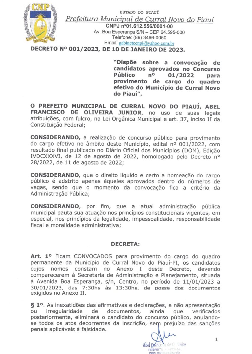 A PREFEITURA MUNICIPAL DE CURRAL NOVO DO PIAUI CONVOCA OS CANDIDATOS APROVADOS EM CONCURSO PÚBLICO Nº 001/2022.