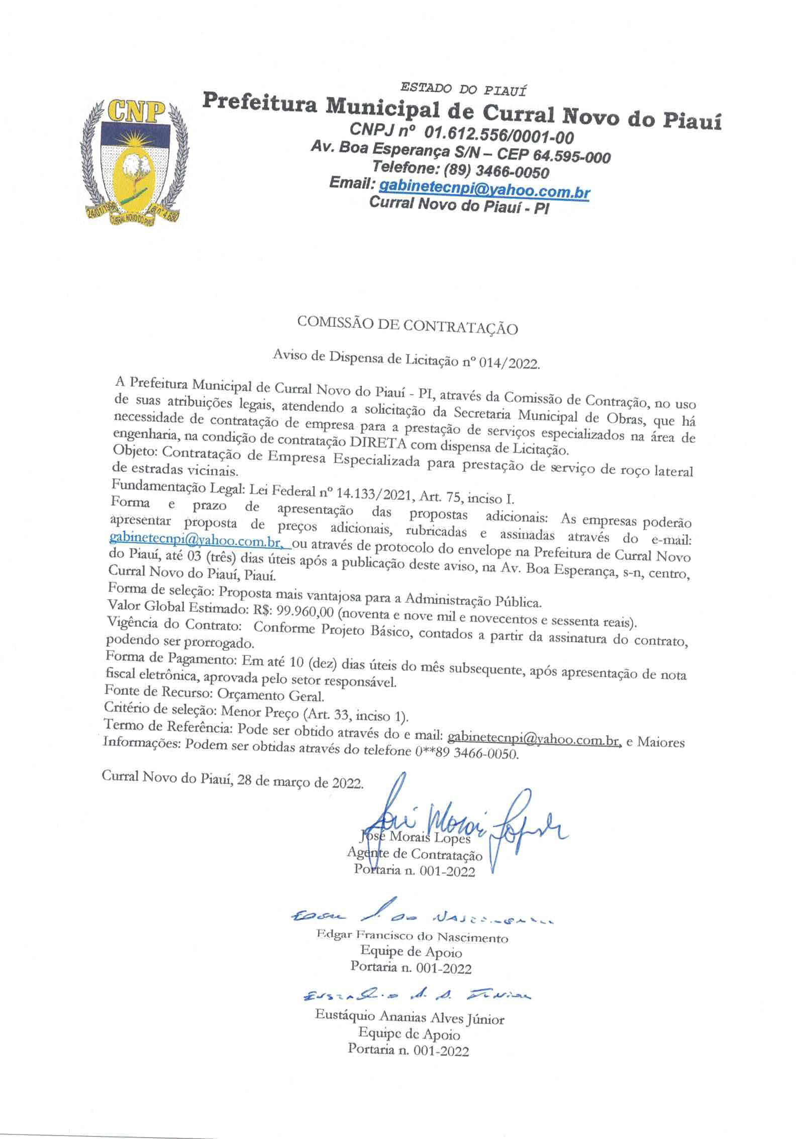 AV. BOA ESPERANÇA, S/N - Bairro: CENTRO - CEP: 64.595-000 - CURRAL NOVO DO PIAUÍ/PI