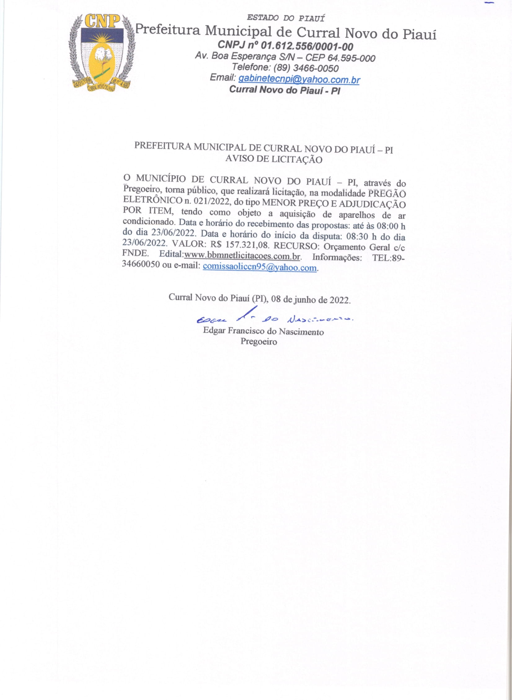 AV. BOA ESPERANÇA, S/N - Bairro: CENTRO - CEP: 64.595-000 - CURRAL NOVO DO PIAUÍ/PI