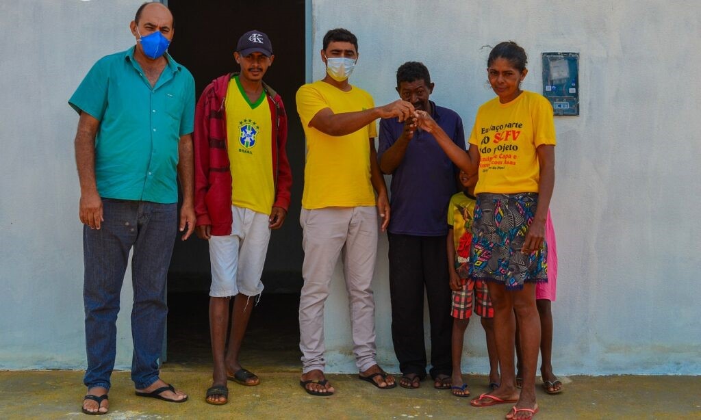 Ela, acompanhada do esposo, José Geraldo da Silva Irmão, e dos três filhos, recebeu as chaves da nova casa das mãos do prefeito Junior de Abel e do controlador interno do município, Erisvaldo Gomes.